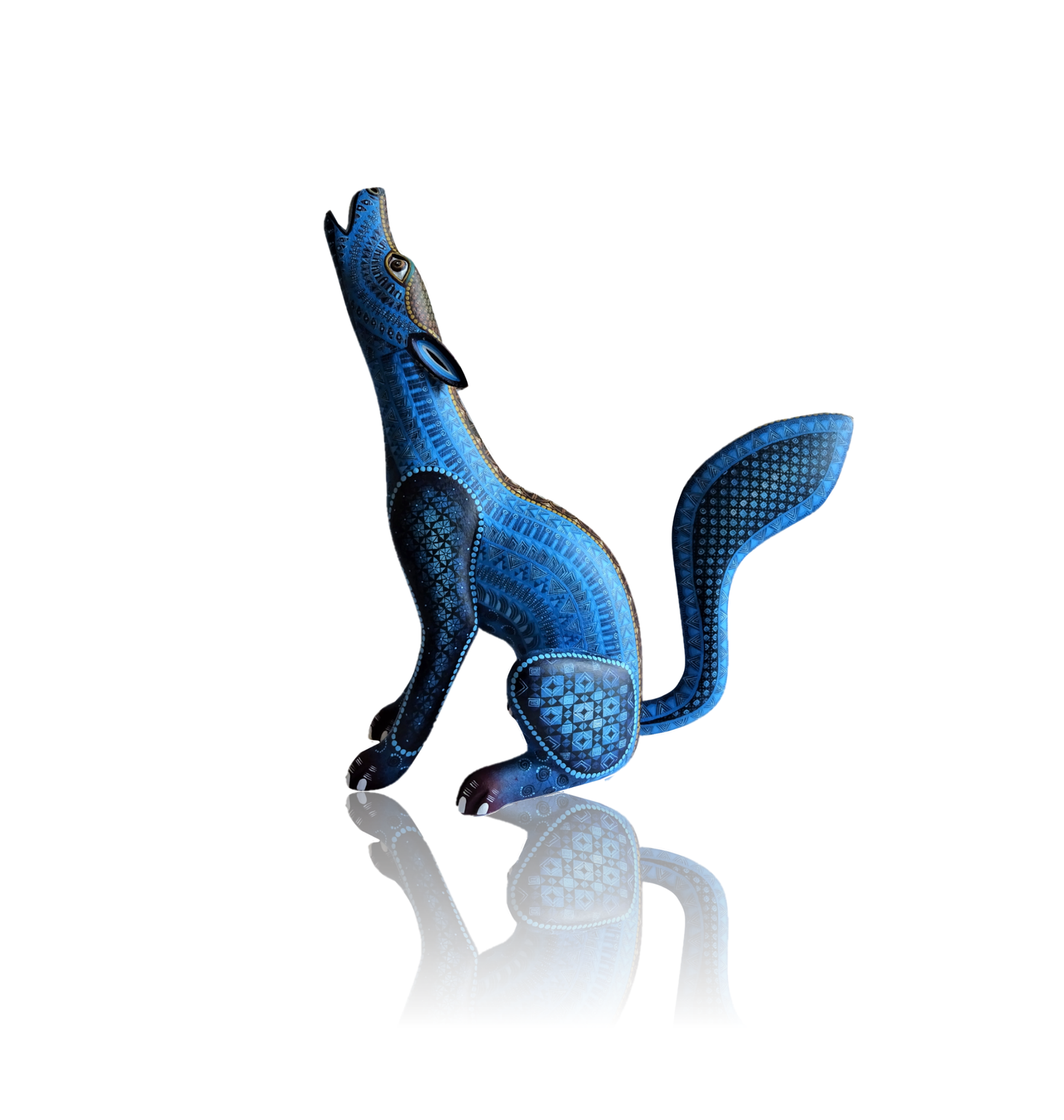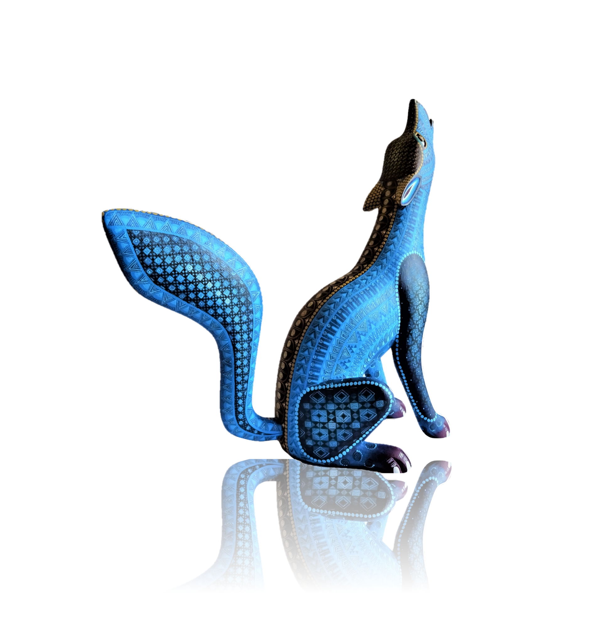 mexikanischen Copalholz handgeschnitzte Coyote stellt einen sogenannten „alebrije“ dar. Diese fantastischen in feiner Handarbeit angefertigten Holzfiguren haben ihren Ursprung in dem Bundesstaat
