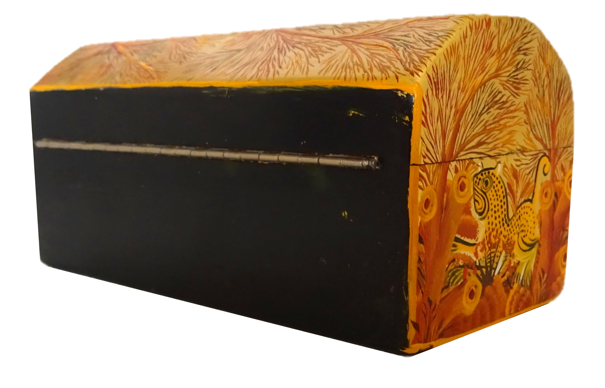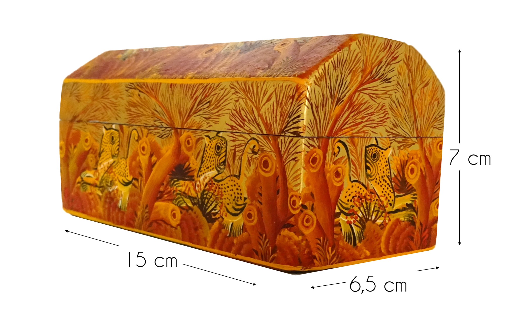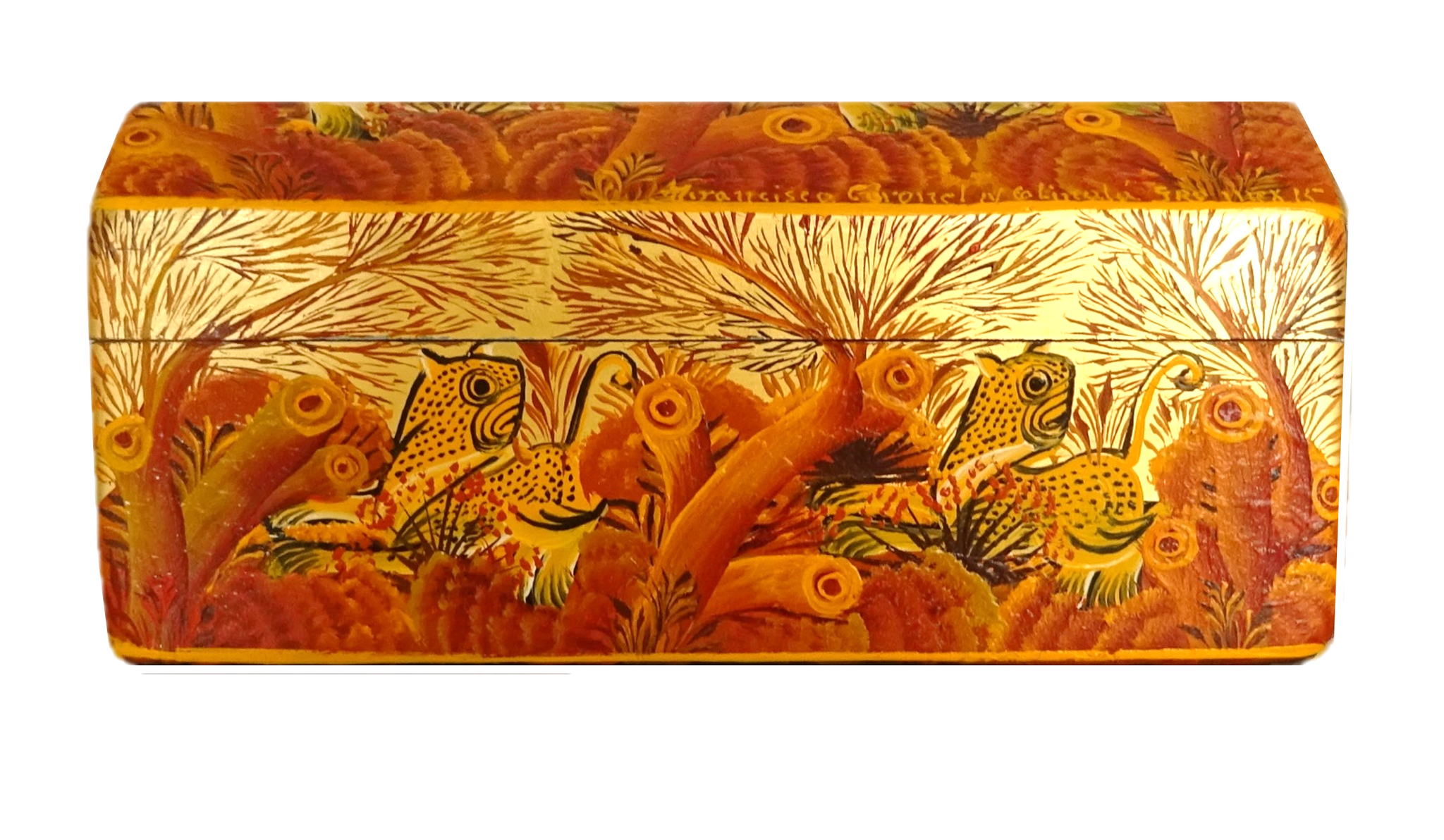 Diese in aufwendiger Handarbeit angefertigte Truhe ist hergestellt aus Linaloe Duftholz und mit Blattsilber verziert. Die farbenfrohe Dschungelwelt (selva) wurde mit viel Liebe zum Detail von dem Künstler auf das Blattsilber gemalt. Auch das separate Unterteil ist bemalt und dient als Standvorrichtung. Die Innenseite ist naturbelassen, beim Öffnen entfaltet sich ein angenehmer Duft. Das edle Unikat zaubert einen Hauch von Luxus und Exotik in Ihr Zuhause.