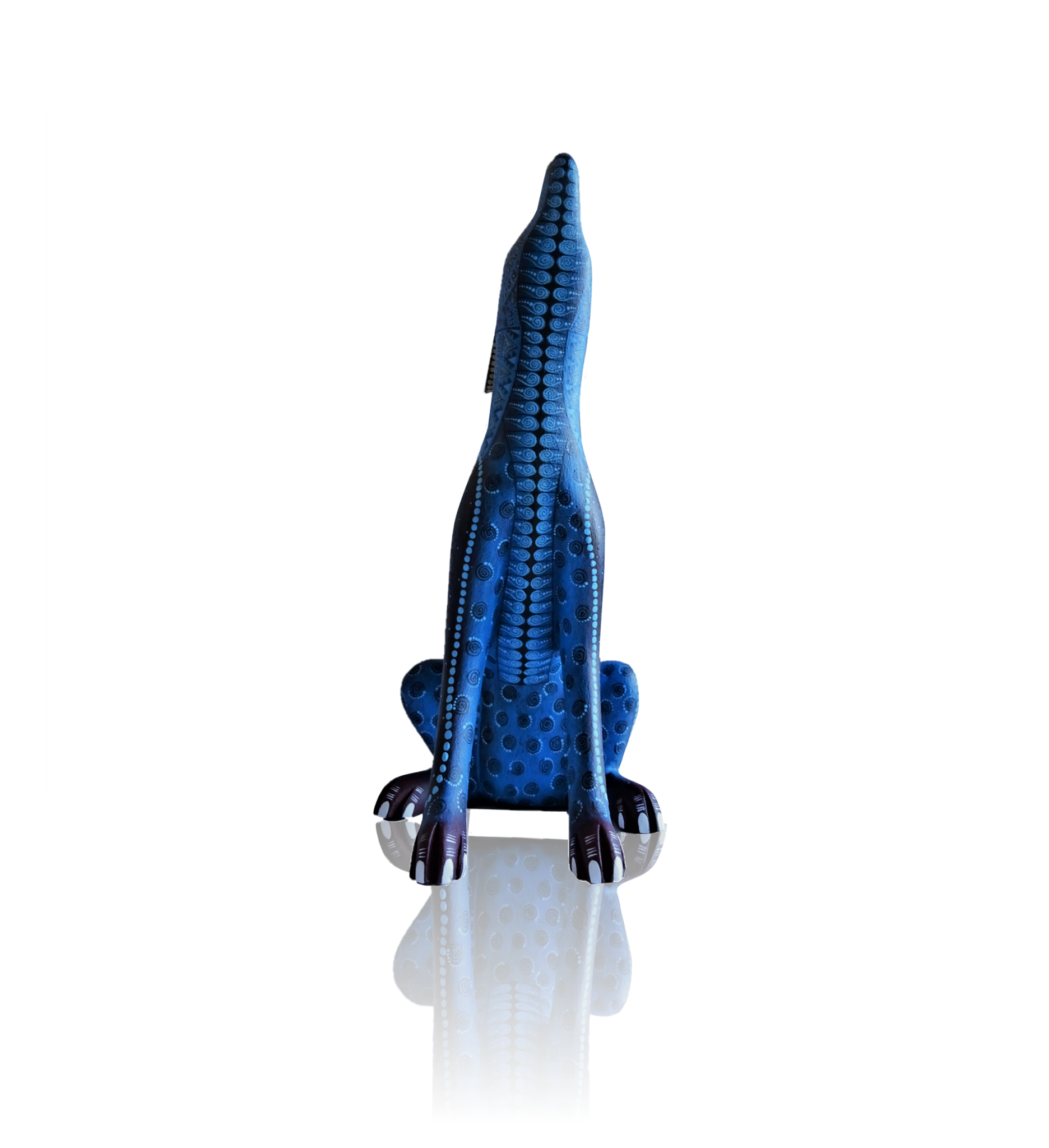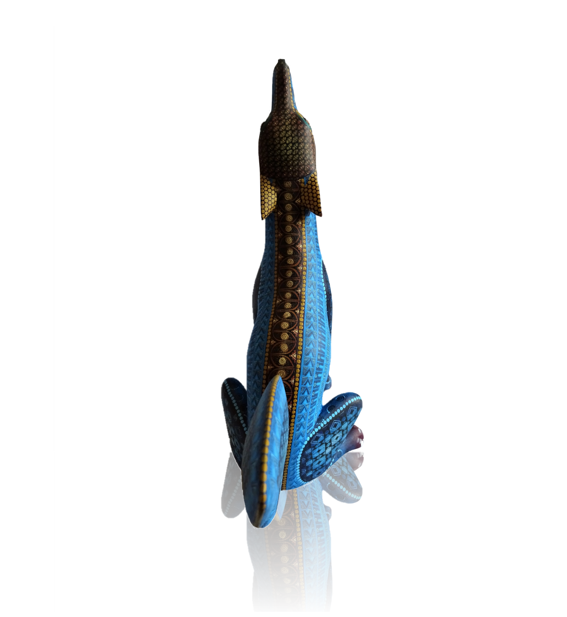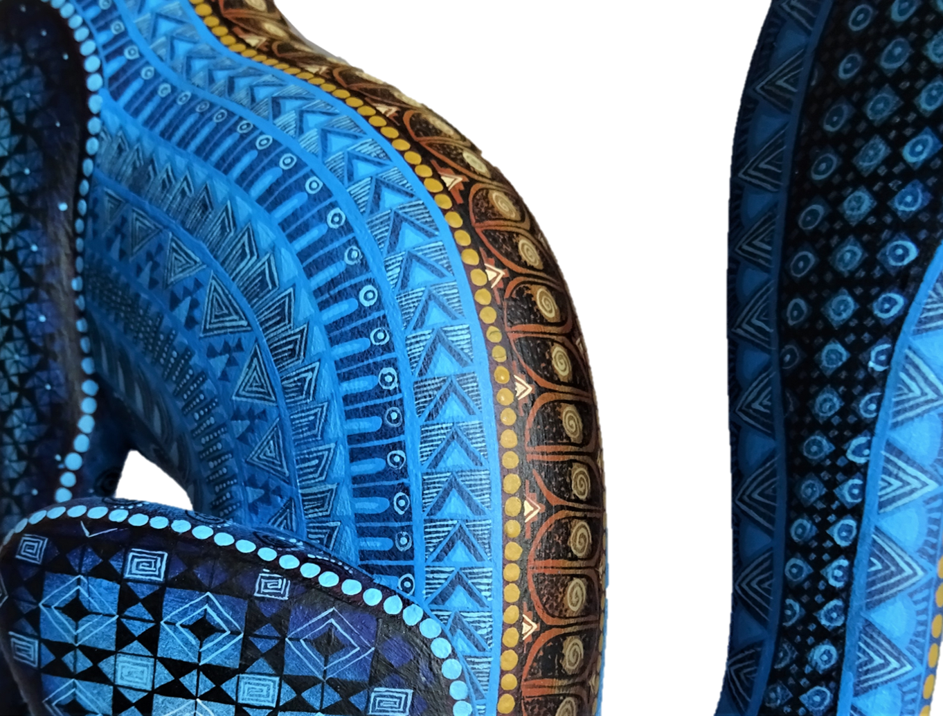 Oaxaca. Nach dem Prozess des Schnitzens werden die Objekte grundiert, aufwendig mit Naturfarben bemalt und mit viel Liebe zum Detail verziert. Das wertvolle Einzelstück weißt eine besondere