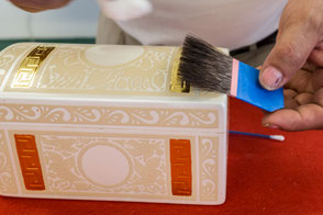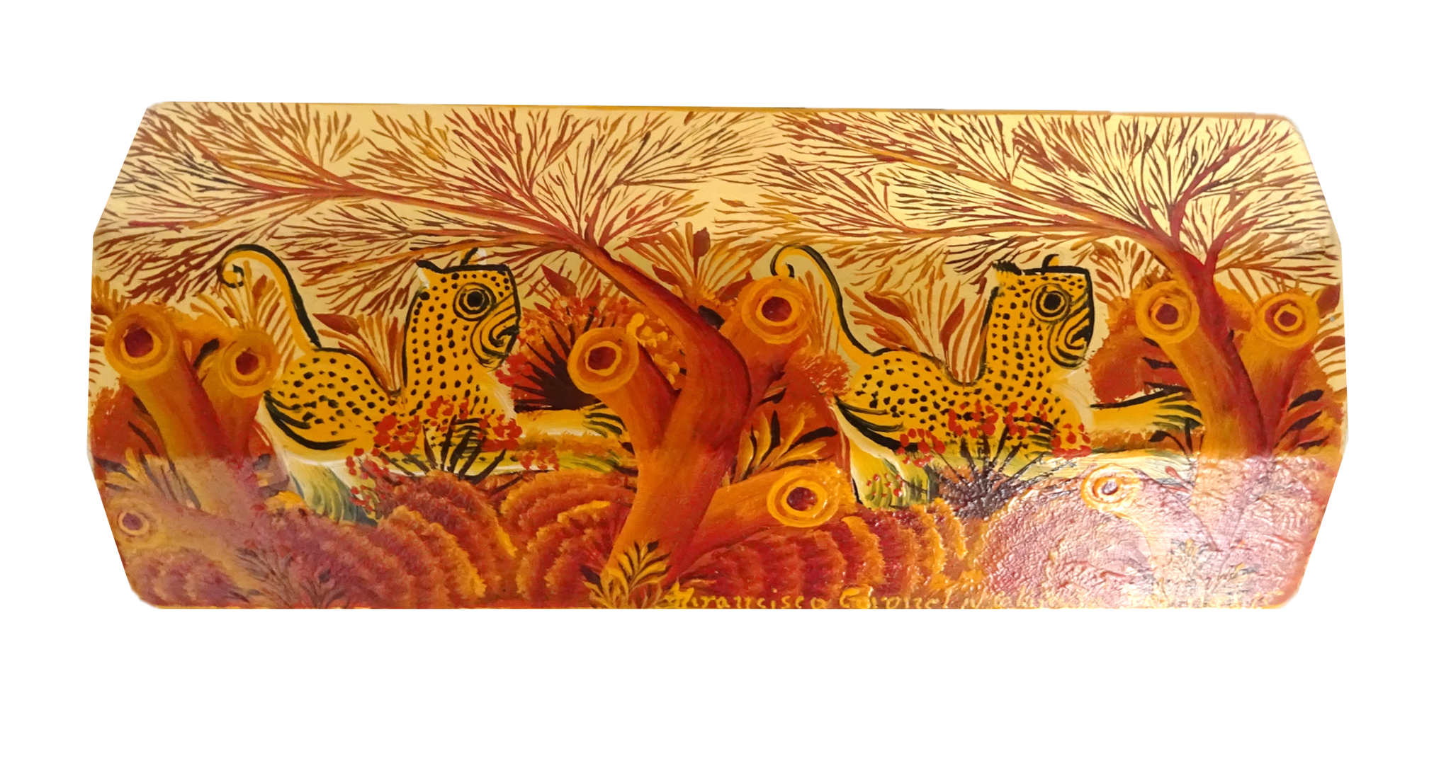 Prozess des Schnitzens werden die Objekte grundiert, aufwendig mit Naturfarben bemalt und mit viel Liebe zum Detail verziert. Die fabelhaften Tiermotive und detaillierten Muster geben Einblick in